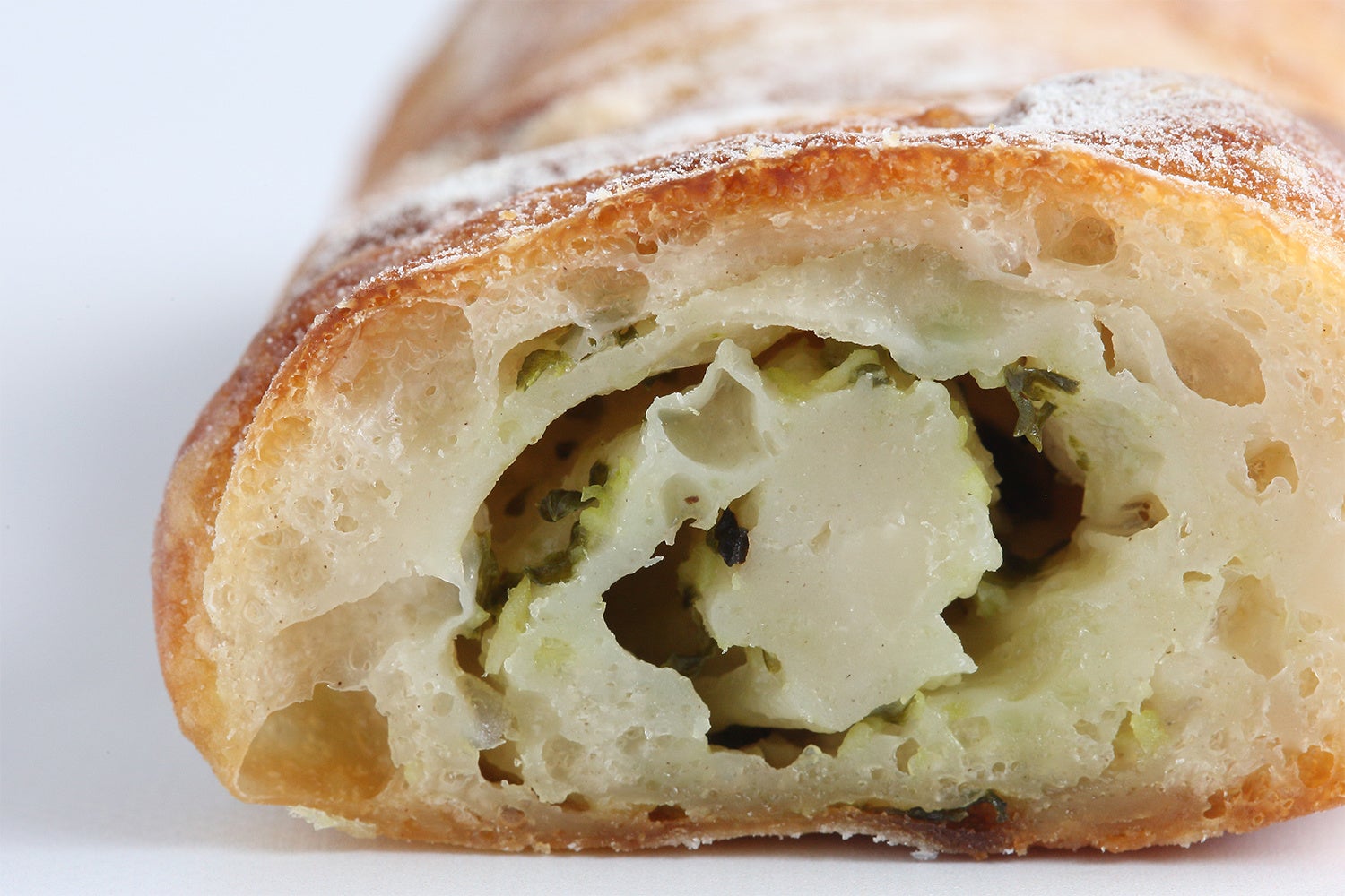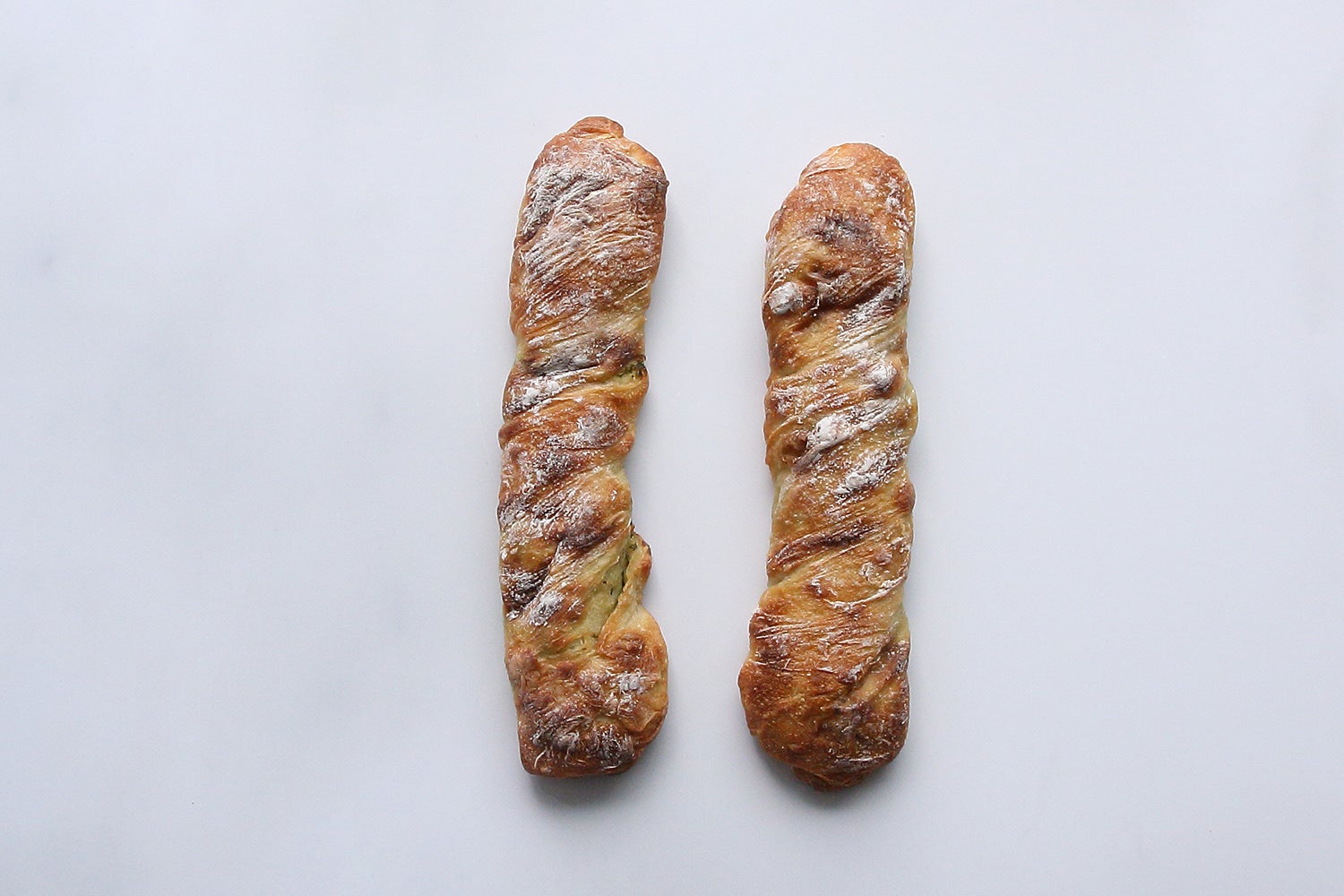 国産小麦100%配合。生地全体に、ガーリックバターをクルクルと巻いているので、全体に香りの良いガーリックの風味が感じられます。
