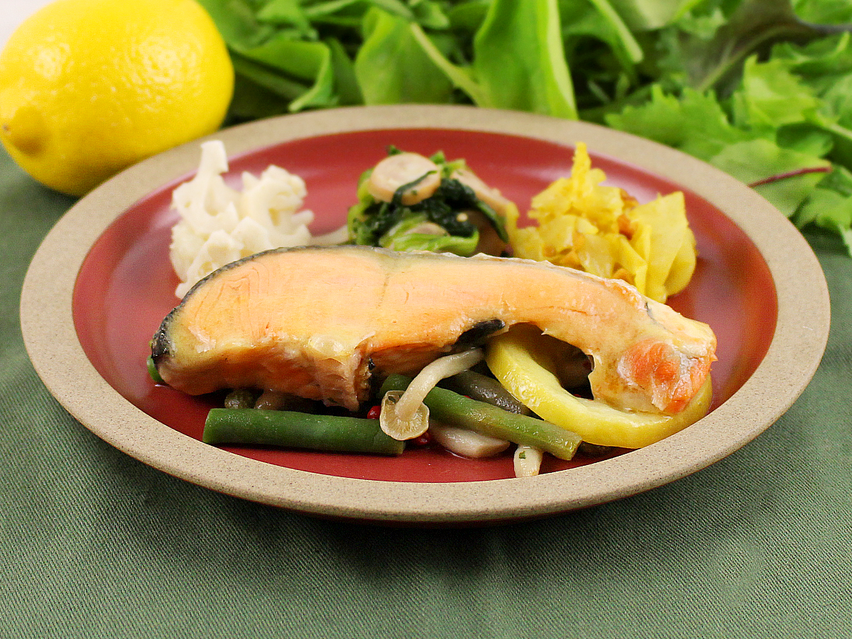 鮭のオーブン焼きにバターのコクとレモンの酸味が効いたソースをかけました。付け合わせにインゲン、しめじ、ケーパー、ピンクペッパーを添えております。