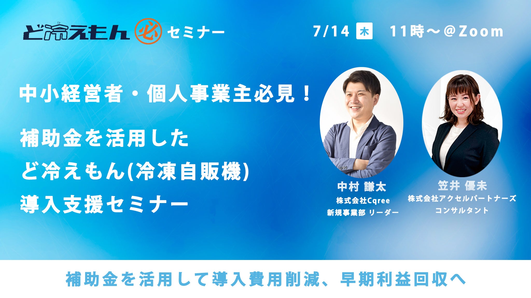 補助金に関するご不明点や、活用方法に加え、今話題の冷凍自販機ど冷えもんについて疑問点が解決されるセミナー(Web)になります。