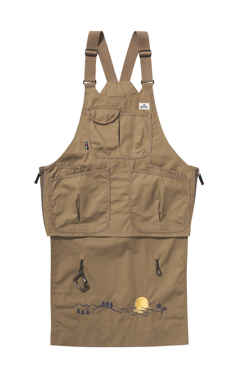 コロナビール専用ポケットとオープナーとしても使えるカラビナ付きビブエプロン。防炎素材で耐久性も高くキャンプやBBQ、DIY作業、園芸など様々なシーンで使える万能アイテム。オープナー付きカラビナが付いた防炎素材のビブエプロンはグリップスワニーとのコラボ商品。