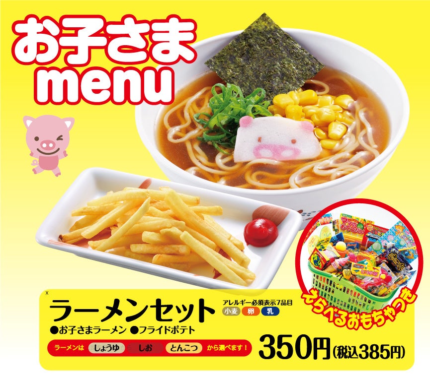 『丸源ラーメン』『二代目丸源』では、選べるおもちゃ付きの「お子さまmenu」のご用意がございます。