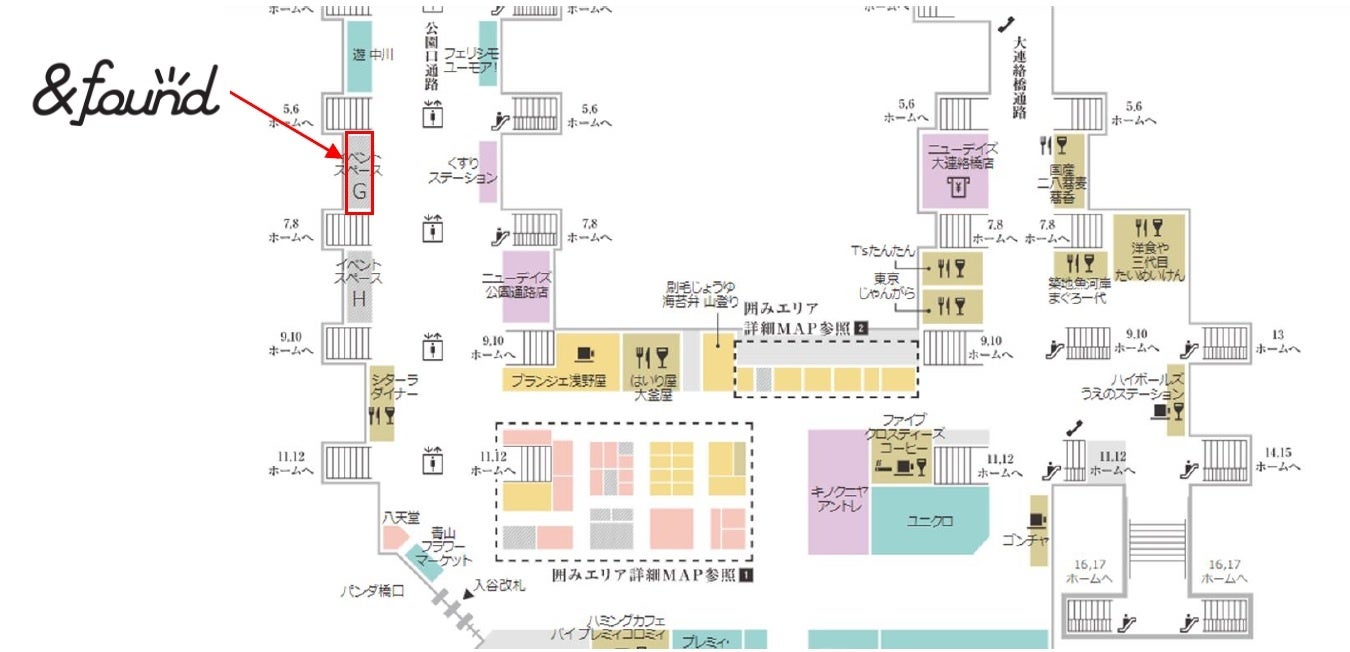 ■ 名称について:語源は駅にある「遺失物取扱所」の英語表記「Lost & Found」のfound(見つかった)が経緯。多くの人が行き交う駅で「新しい発見・気づき」や「きっかけ」に出会える場所として「&found」と名づけました。また、様々なパートナーとつながり、一緒に新しい提案をエキナカから行うことを願い「&」を冠しています。