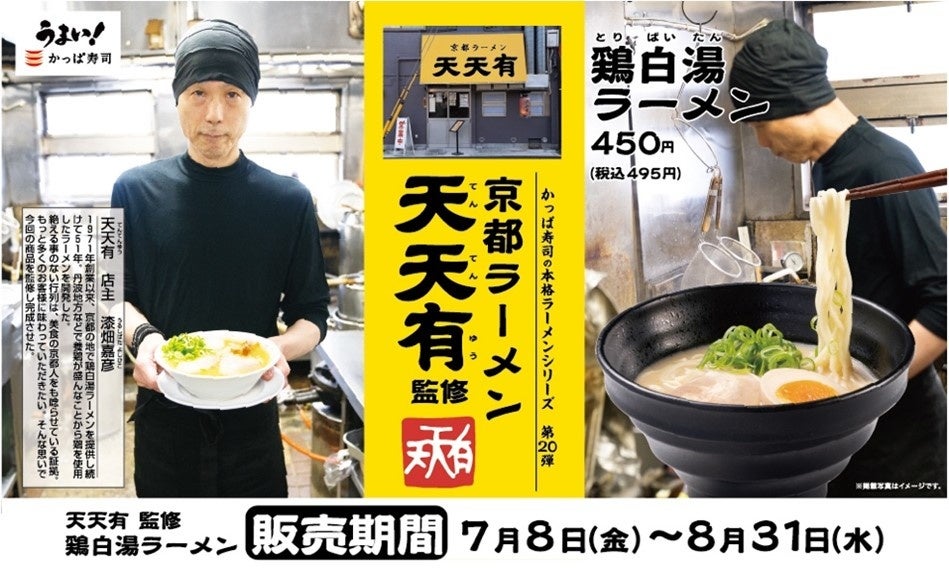 記念すべき第20弾の実施にあたり、監修依頼の名店候補は多数に及びました。その中でも「このラーメンをもっと多くの人に味わっていただきたい」という「京都ラーメン天天有」店主 漆畑氏の強い思いと、他にはない唯一無二の鶏白湯スープの味にかっぱ寿司が惚れ込んだことにより今回の夢のコラボが実現いたしました。