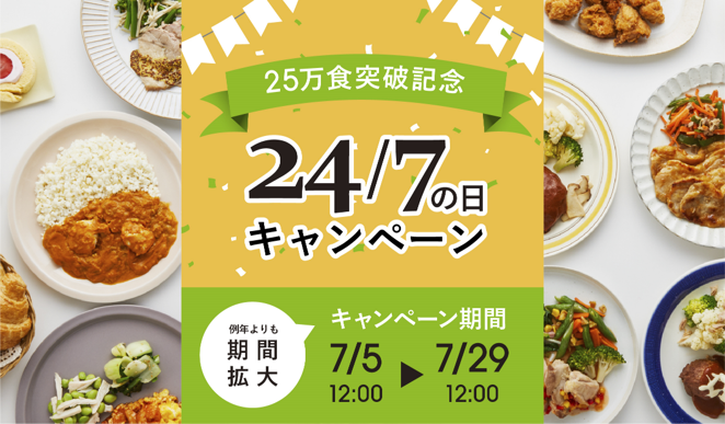 「24/7 DELI&SWEETS」は、2020年のサービス開始よりダイエッターの食を支え続け、累計25万食を突破しました。 日頃の感謝の意を込めて、「お客様へ還元していきたい」という気持ちと「サービスをより広めていきたい」という思いで今回の「24/7の日」キャンペーンを開催することになりました。