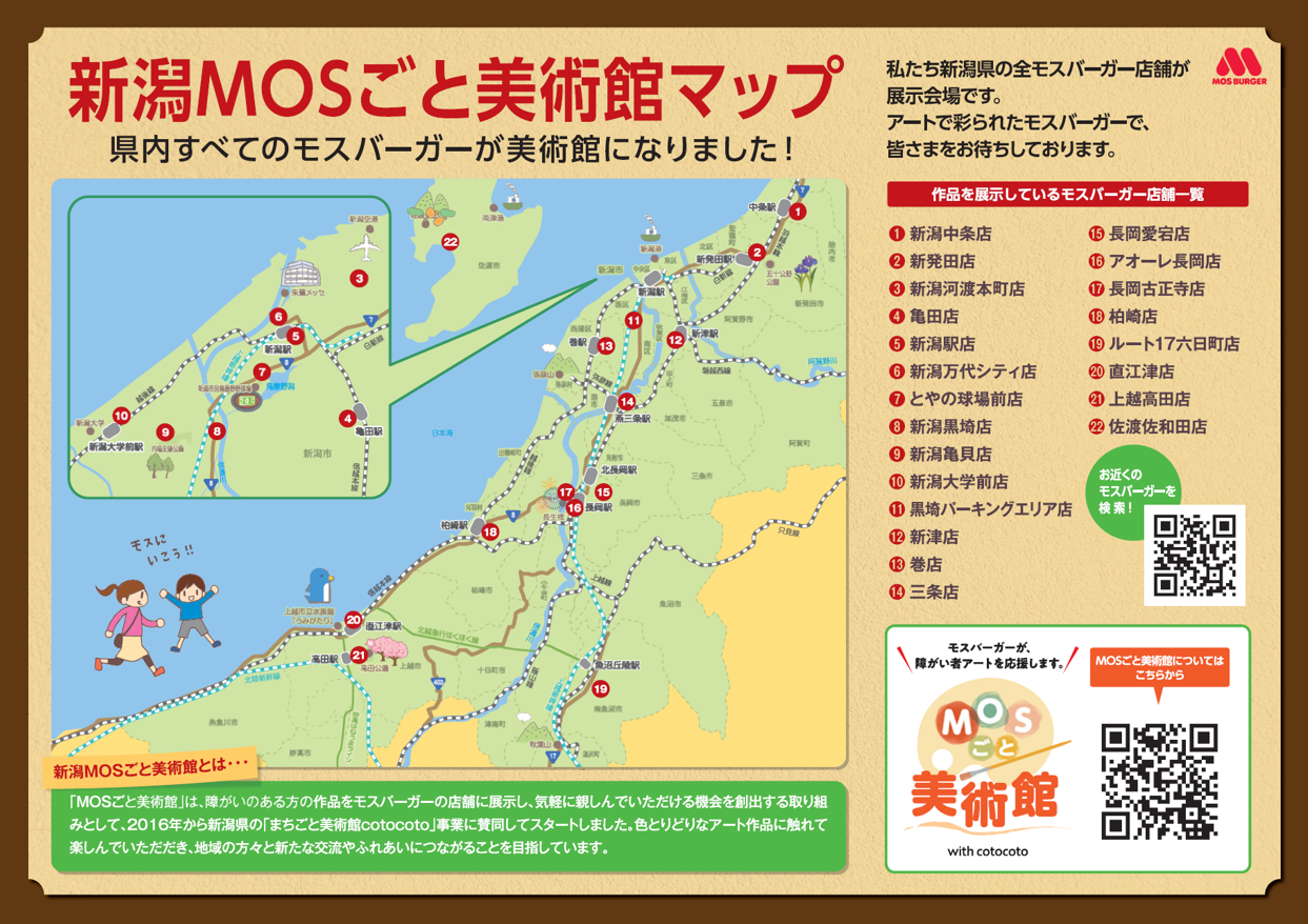 今年は「新潟MOSごと美術館 2022」として、3年ぶりに新潟県内のモスバーガー全22店舗で開催いたします。お店の雰囲気に合うアート作品を2点程度展示し、8月下旬には作品の入れ替えも行いますので、さまざまなアート作品をお店ごとに楽しんでいただけます。作品にはアーティストの紹介を添えて展示し、作品がより身近に感じられる工夫をします。