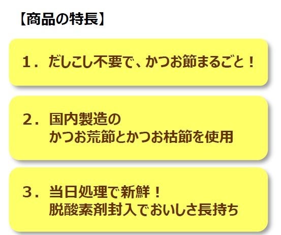 新商品「めっちゃ使えるふわふわかつお粉50g」は、ふんわりと口どけがいいためトッピングや混ぜ込み料理にはもちろん、だしとして使え、こさずにそのままお召しあがりいただけます。かつお節の恵みをまるごといただける、体にも環境にもうれしい商品です。