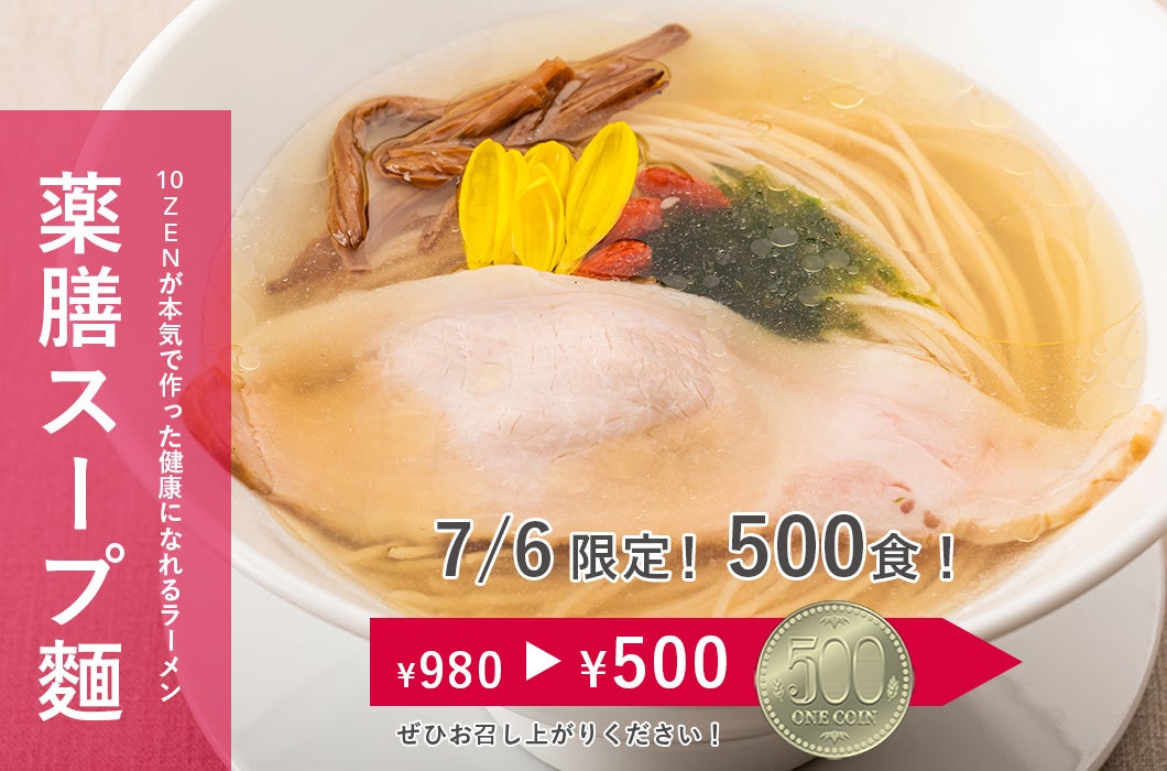 - 新メニューの発売を記念して7/6(水)限定で薬膳スープ麺が¥980円→¥500円!!