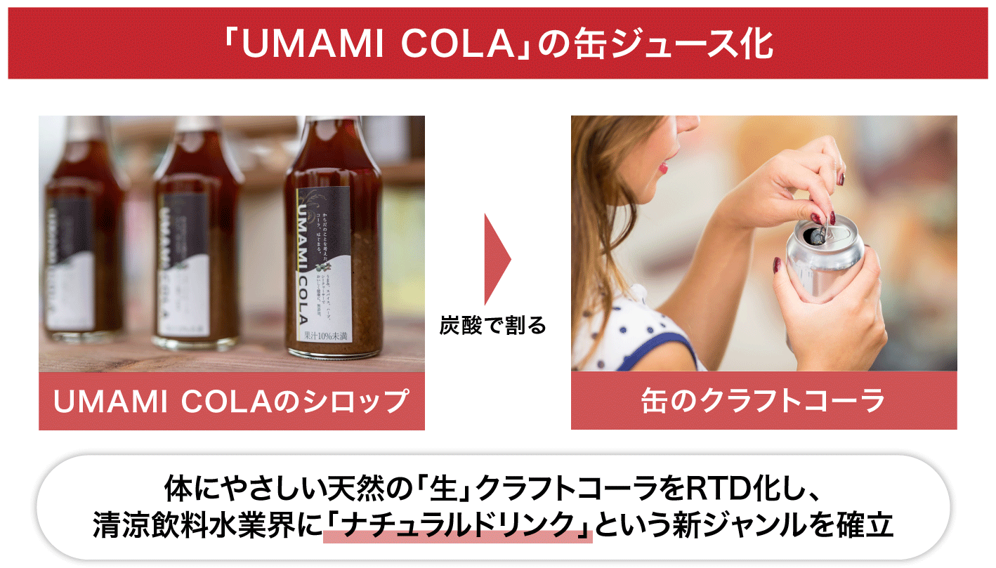 UMAMI COLA株式会社は、人工甘味料を使用せずに安心して毎日飲める「ナチュラルドリンク」という新たな分野を清涼飲料水業界に確立し、クラフトコーラ業界はもちろん、清涼飲料水業界全体のさらなる地位向上を図りたいと考えています。弊社は、「UMAMI COLA」シロップを炭酸で割り、RTD(缶ジュース)化することで清涼飲料水業界に「ナチュラルドリンク」という新たな選択肢を提案したいと考えています。
