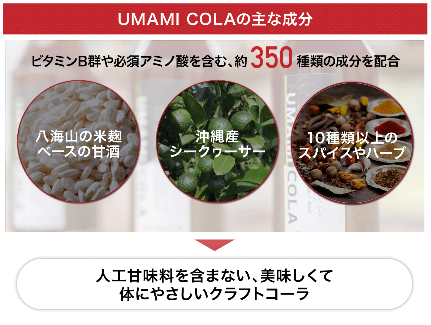 「UMAMI COLA」は、八海醸造株式会社の米麹だけで作った甘酒をベースに、スパイスやハーブ、沖縄県産のシークヮーサーなどの柑橘類から作られる天然の「生」クラフトコーラです。添加物や遺伝子組み換え、果糖ブドウ糖液糖や人工甘味料は使用しない透明性の高い原材料のみで製造しています。