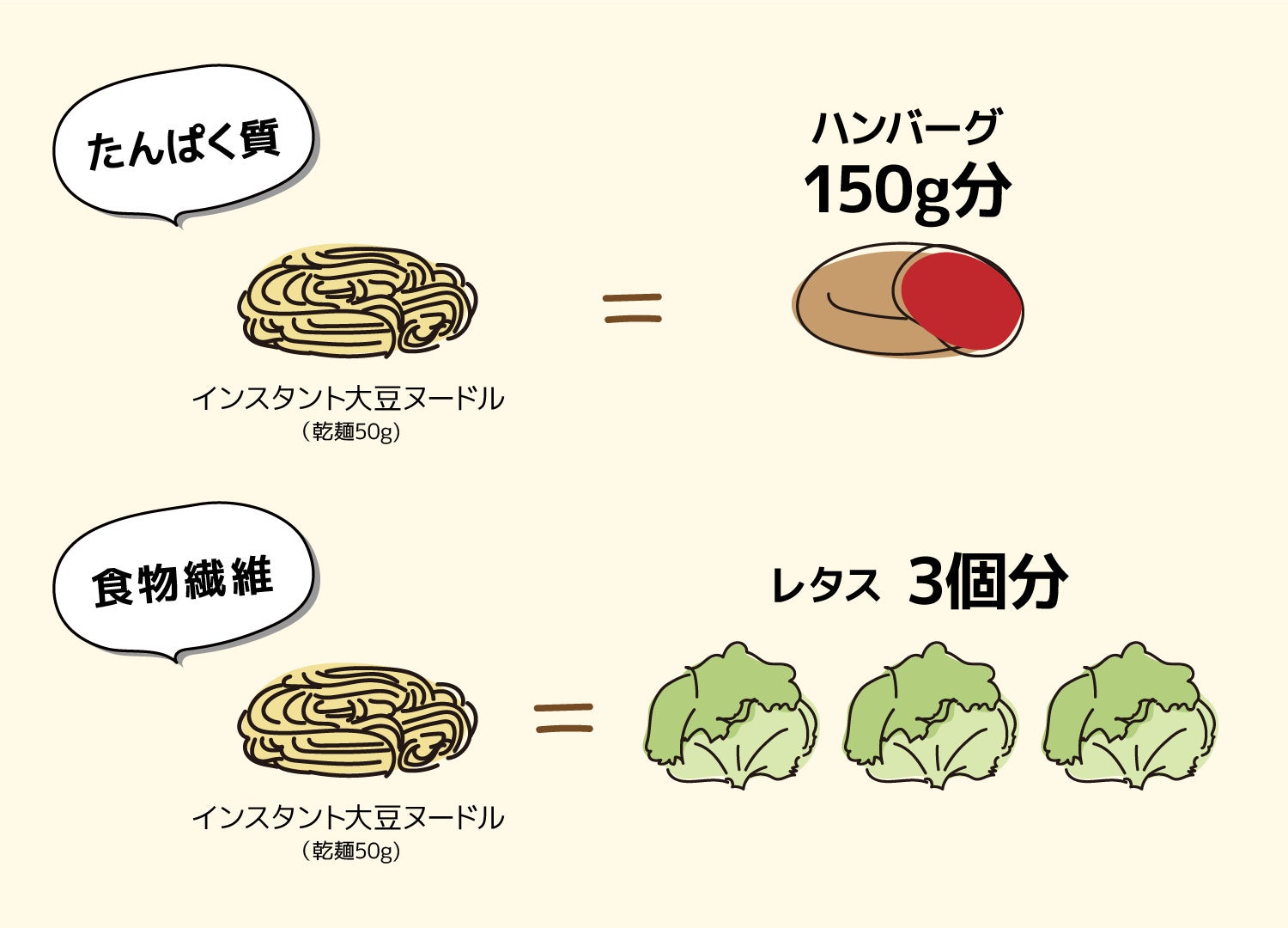 この1食分だけでハンバーグ150g相当のたんぱく質(20g)、レタス約3個分(10g)相当の食物繊維が含まれています。※2