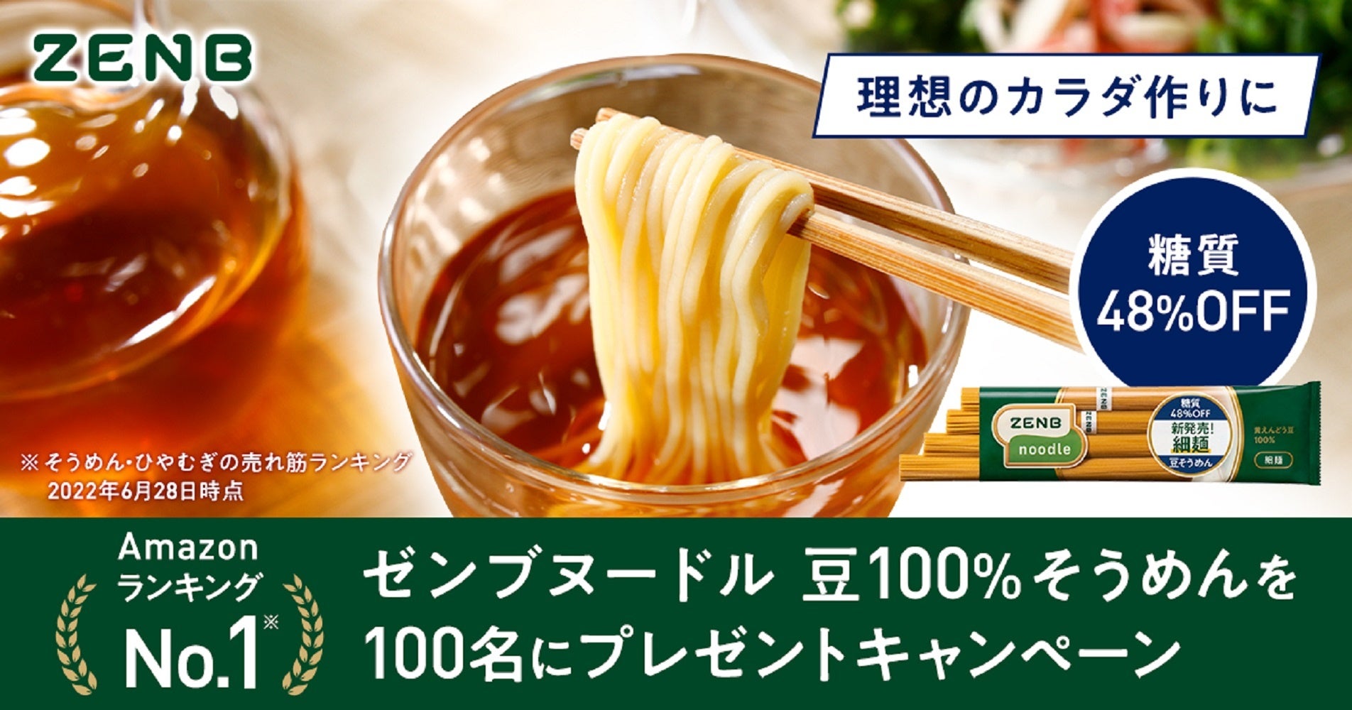 株式会社ZENB JAPAN(ゼンブ ジャパン)(愛知県半田市、以下 ZENB)は、2022年7月6日(水)より、いつものそうめんより糖質48%OFFで楽しめる豆100%そうめん「ZENBヌードル細麺」を体験できる「Amazon売上ランキングNo.1※!ゼンブヌードル豆100%そうめんを100名にプレゼントキャンペーン」を開始します。