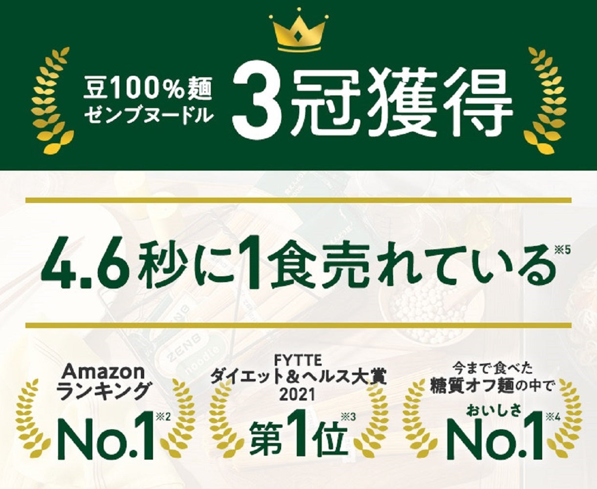 小麦でも米でもない第3の麺「ZENBヌードル」は、累計販売数500万食を突破し、さらに『Amazon ランキング No.1※2』『FYTTEダイエット&ヘルス大賞2021 第1位※3』『今まで食べた糖質オフ麺の中でおいしさ No.1※4』の3冠達成しています。