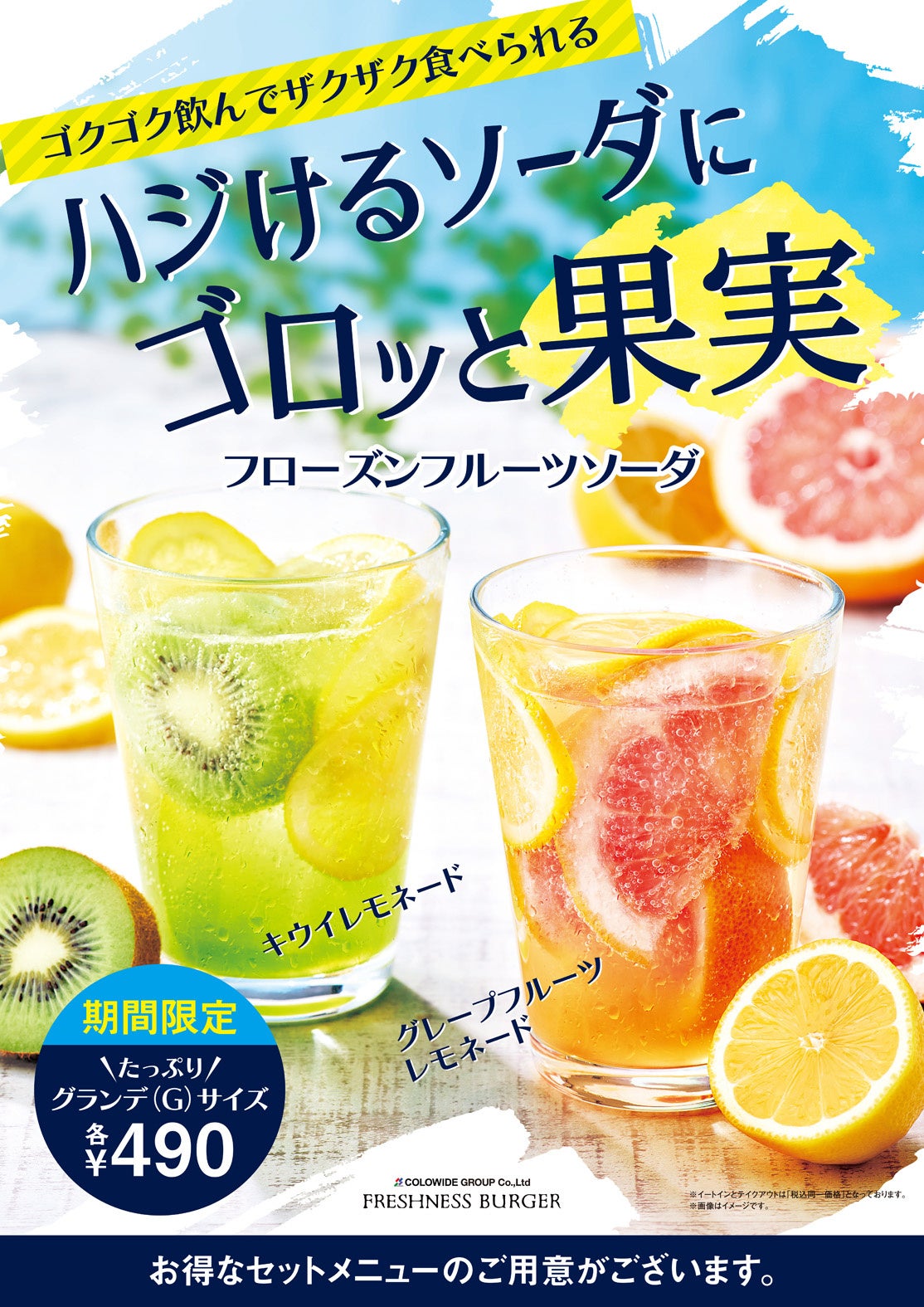 コロワイドグループの株式会社フレッシュネス(代表取締役社長:齋藤 健太朗/本社:神奈川県横浜市西区)は、2022年7月13日(水)より、ハンバーガーチェーン「フレッシュネスバーガー」にて、生のフルーツを凍らせた果実氷をゴロッと豪快に使用したフローズンフルーツソーダ「グレープフルーツレモネード」「キウイレモネード」の2種類を期間限定発売いたします。