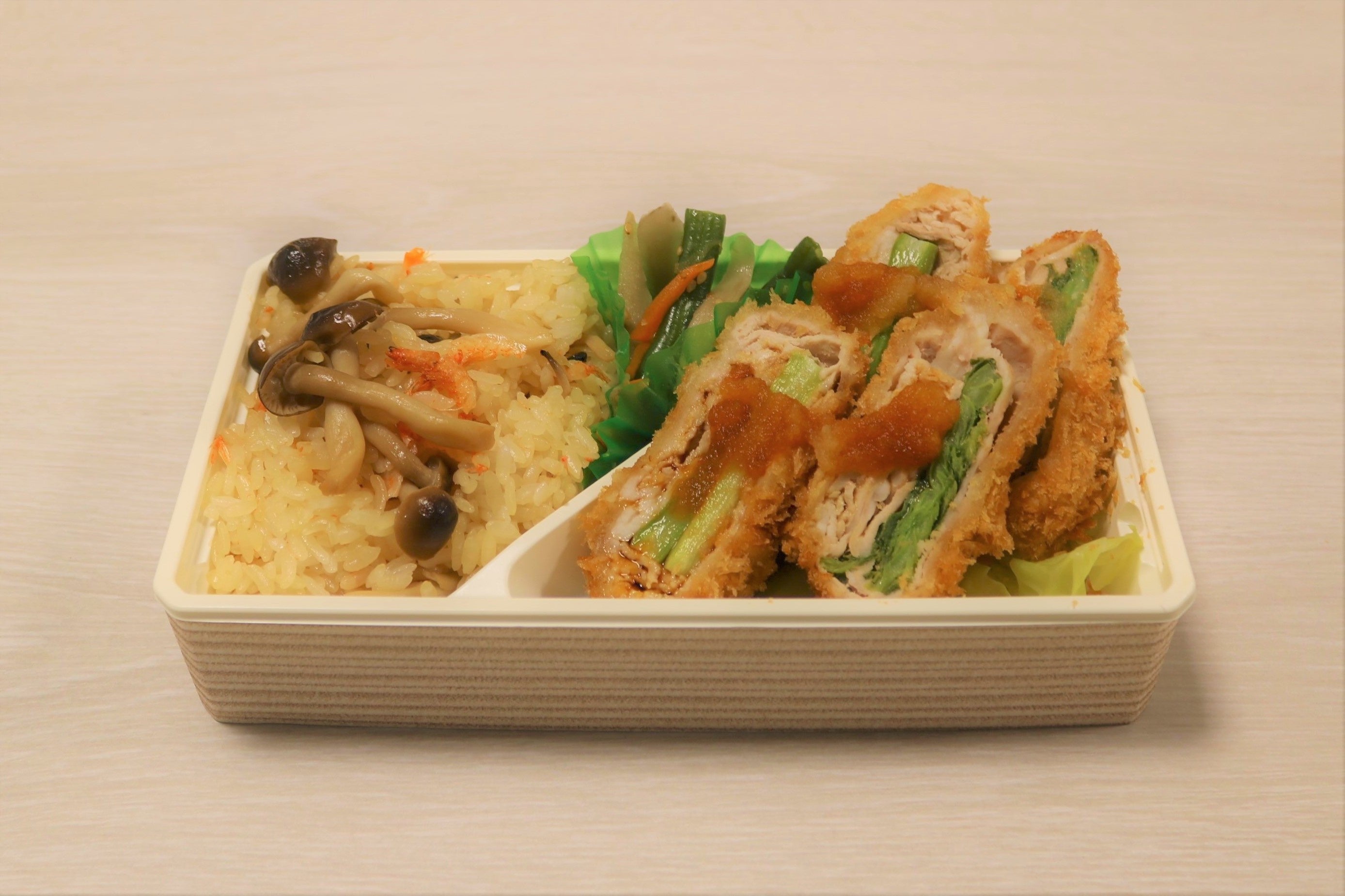 季節ごとの混ぜごはんと2種の旬の野菜かつが入ったお弁当です。夏はオクラといんげんのかつと枝豆ごはんの組み合わせでご用意しております。