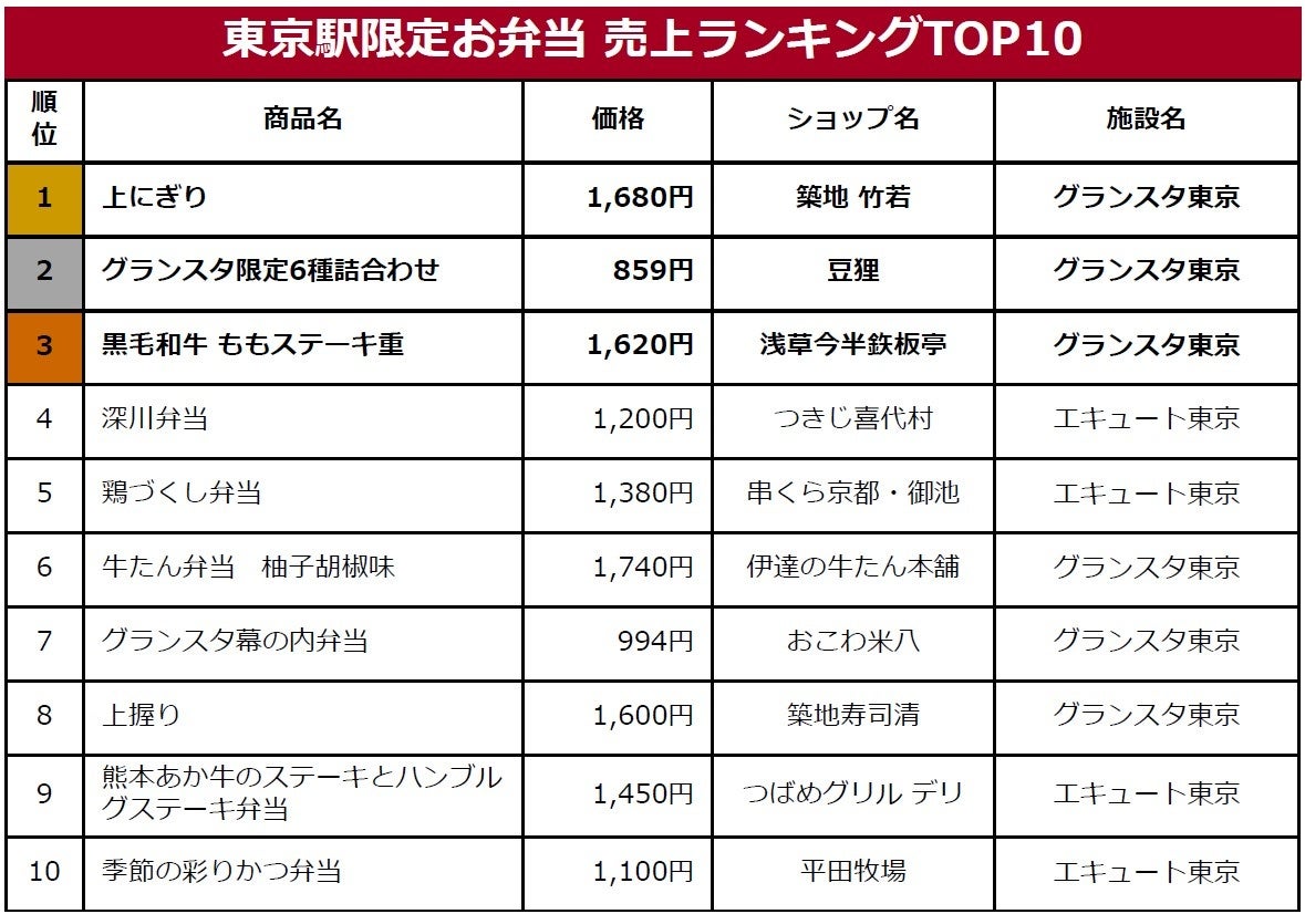 株式会社JR東日本クロスステーション デベロップメントカンパニー(所在地:東京都渋谷区、カンパニー長:杉村 晶生)は、運営する東京駅のエキナカ商業施設エキュート東京・グランスタで販売する東京駅限定のお弁当を対象とした「東京駅限定お弁当売上ランキングTOP10」(※) を発表します。プロの目利きが厳選したネタを使用したお寿司や6種類のいなりが一度に楽しめるお弁当、黒毛和牛を使用した贅沢なお弁当など彩り豊かなお弁当がランクインしました。夏の帰省や旅のおともに東京駅限定のお弁当をご堪能ください。
