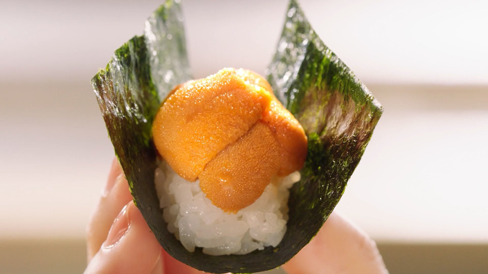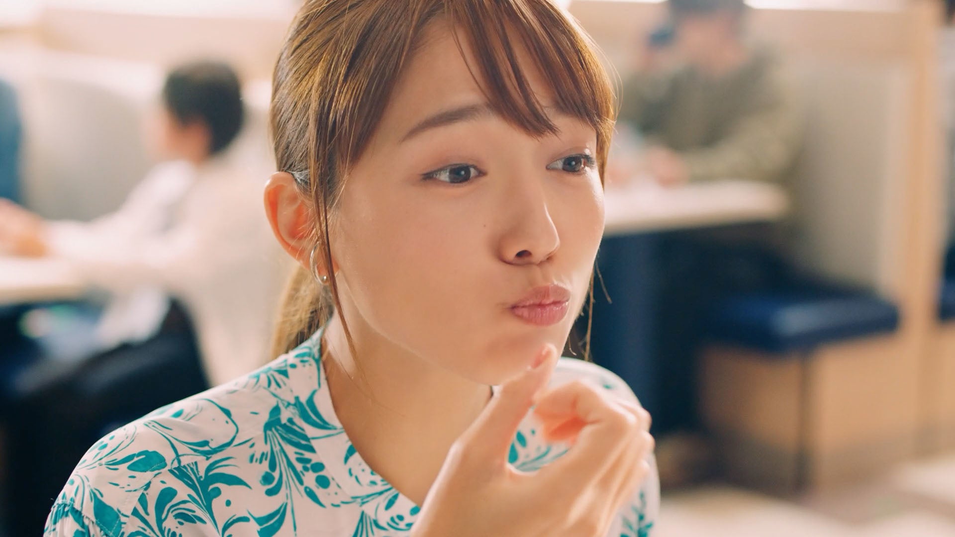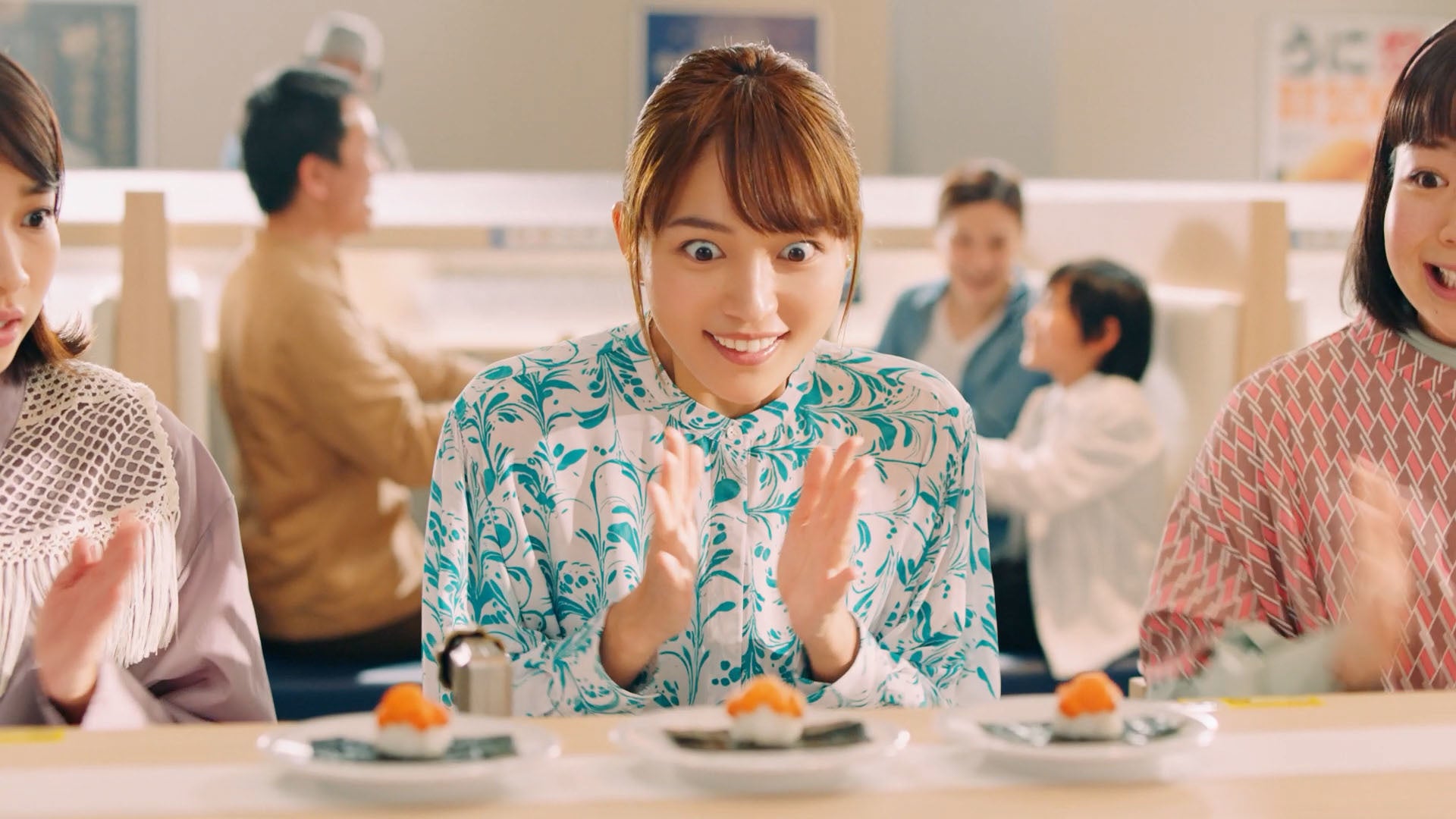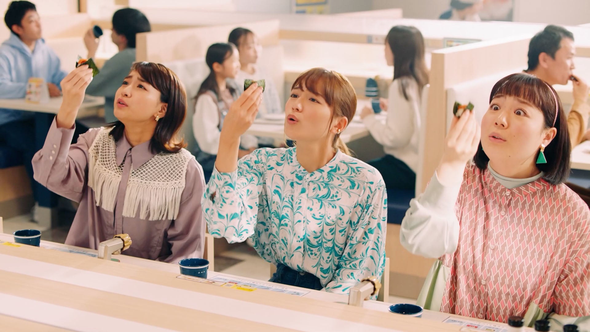 とにかくお寿司が大好きで、よく高校時代の友人とはま寿司で食事をする川口さん。「うにつつみ」が待ち遠しくてたまらない3人は、ストレートレーンで届くのを待ちながら「うーに、うーに、100円!」と手拍子を打っています。3人の元に「うにつつみ」が届くと、ずっと待ち焦がれていたとばかりに愛おしそうな表情で持ち上げ、ぱくりと一口。うにの濃厚な風味とくちどけに、思わず「はまい!」と声を揃えます。「明日もうにっちゃう?」と言う川口さんのお茶目なセリフと表情にもご注目ください。