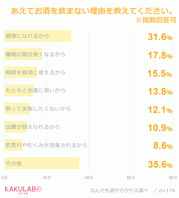 ですが今回、最も回答率が高かったのは「その他」で36%に上りました。選択肢に当てはまらない理由があるようです。その内訳を見てみると、最も多かったのは「運転するから」、次いで「翌日の仕事に影響があるから」でした。「ソバーキュリアス」のようにポジティブな感情でお酒を飲まないというよりも、「飲みたいけれど飲むのを我慢する」といったややネガティブな感情が見え隠れします。