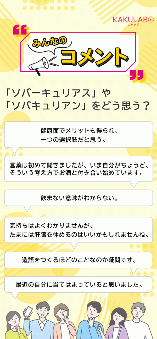多くは好意的であり、「健康のために良いと思う」「健康面でメリットも得られ、一つの選択肢だと思う」「言葉は初めて聞きましたが、いま自分がちょうど、そういう考え方でお酒と付き合い始めています」「最近の自分に当てはまっていると思いました」など全面的に賛同する意見や、ソバキュリアンを自認する意見も見受けられました。