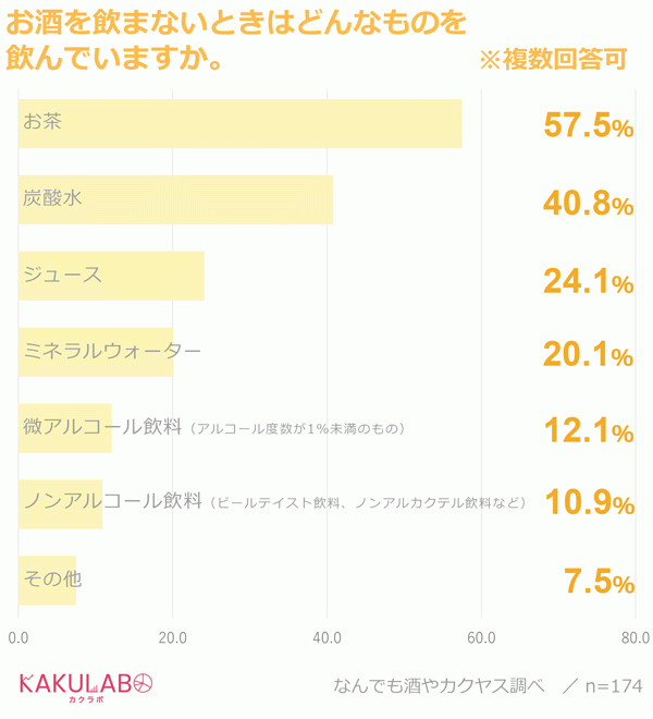 では、そうした人たちはお酒を飲まないときにどんなものを飲んでいるのでしょうか。複数回答可で聞いてみたところ、最も多かったのは「お茶」で57%、次いで「炭酸水」41%、「ジュース」24%と続きます。