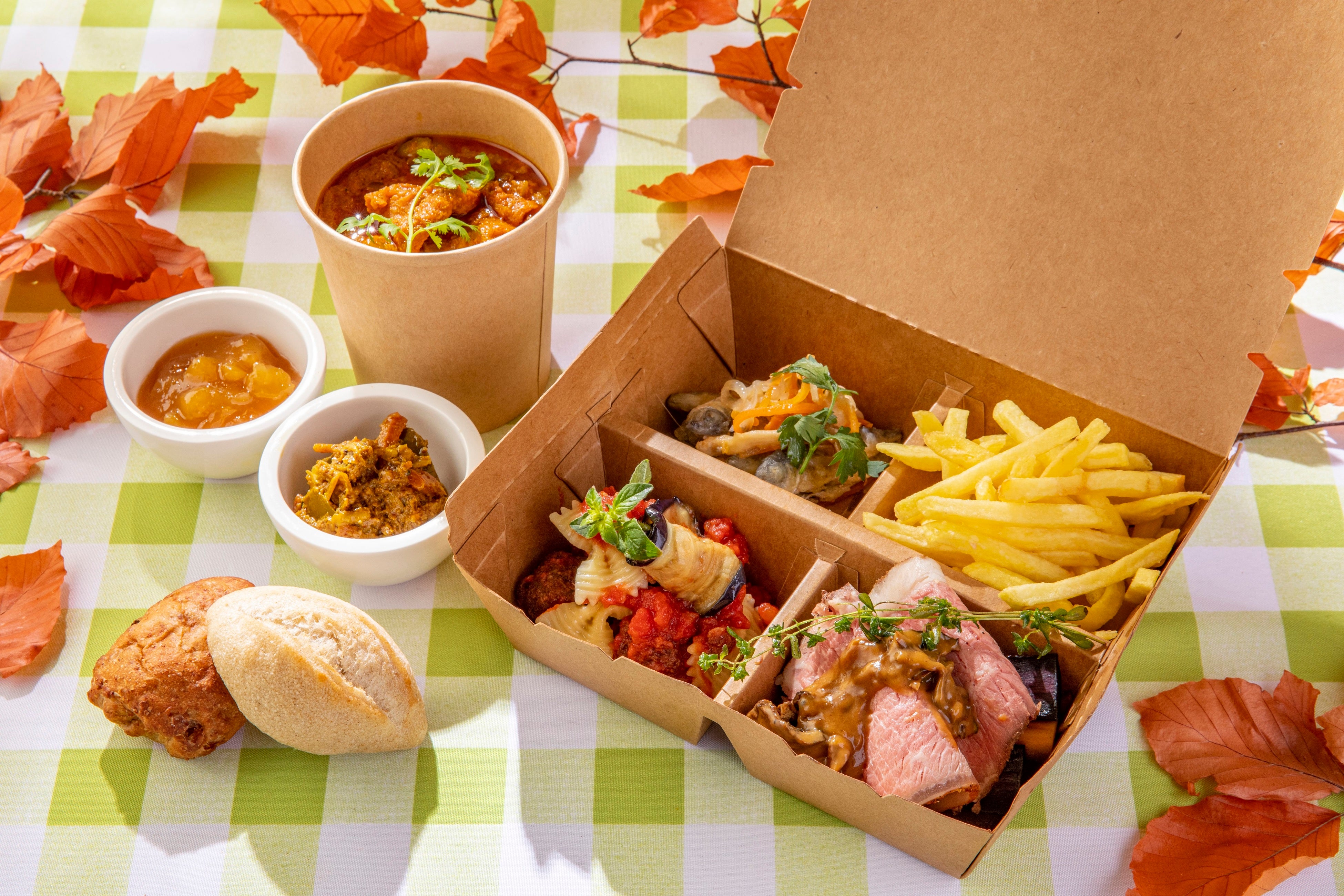 ■オータムランチ&ディナービュッフェ テイクアウトボックスビュッフェで提供しているメニューの一部より、お好きなメイン料理3品、スープ料理1品をお選びいただけるテイクアウトボックスです。