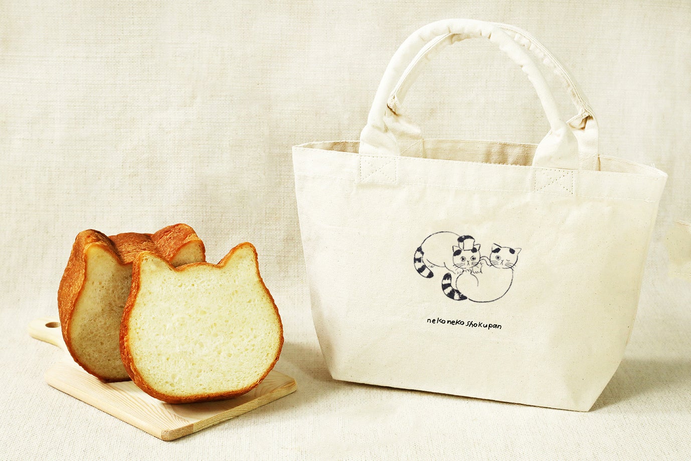 ・内容:ねこねこ食パン プレーン1本、オリジナルデザインのトートバッグ1枚をセットにしました。トートバッグはお弁当や水筒を入れたり、ちょっとしたお買い物にもぴったりです。