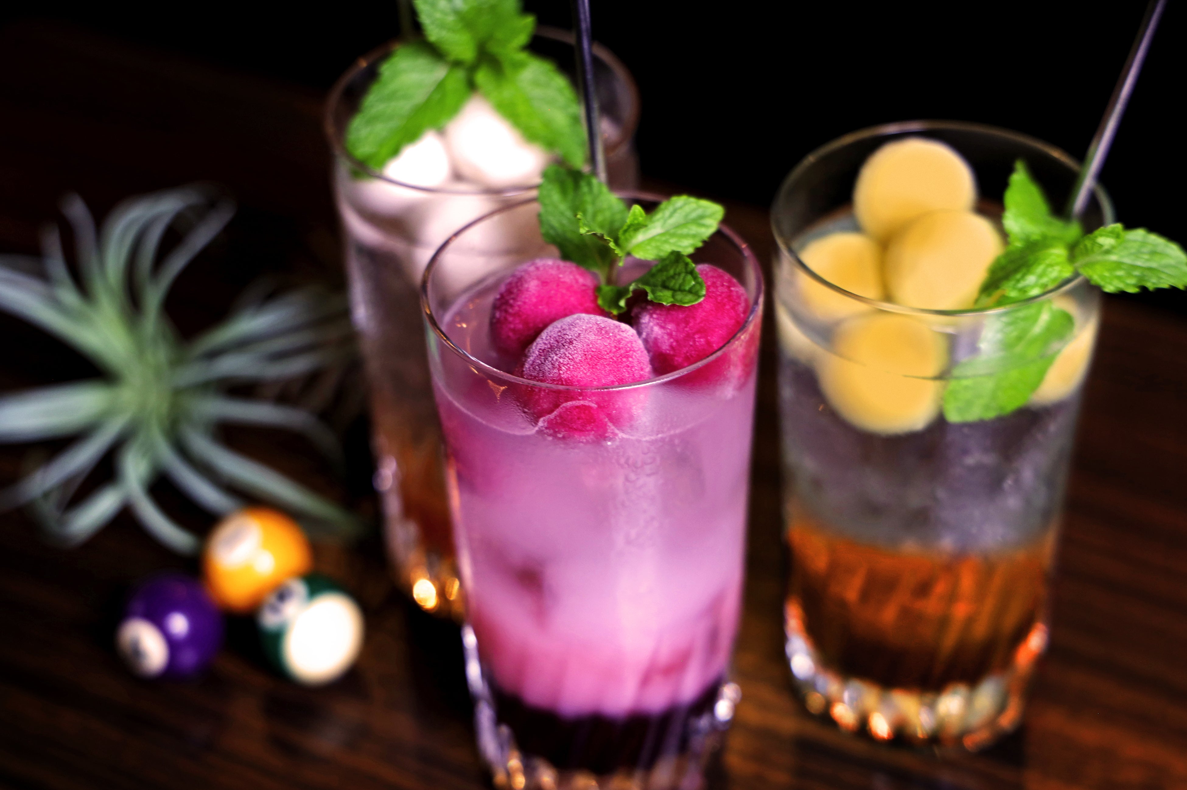 7月11日(月)からバグース新宿西口店、バグース銀座店、バグース錦糸町店、バグース横浜西口店、バネバグース宮益坂店の5店舗でビリヤードをイメージした3種のカクテルを販売します。ビリヤードの球に見立てたアイスボールをマドラーで撞いて味わう、その名も“ブレイクショット・カクテル”!焼酎とフルーツ系リキュールをソーダで割り、ピーチ、グレープ、マンゴー味のアイスボールをゴロゴロ入れて仕上げた夏にぴったりのカクテルです。最初は混ぜずにストレートなリキュールの味わいをお楽しみください。その後アイスボールをマドラーでザクザク崩すと甘くて冷たいフローズンカクテルの完成です!