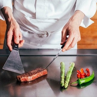 ダイナミックなシェフパフォーマンスとともに、国産食材をふんだんに使用した鉄板焼コースを楽しめる、グランド ハイアット 東京「けやき坂」。注目は、東京都唯一の黒毛和牛を料理長考案フードで飼育した、地産地消の希少な「けやき坂ビーフ」 。