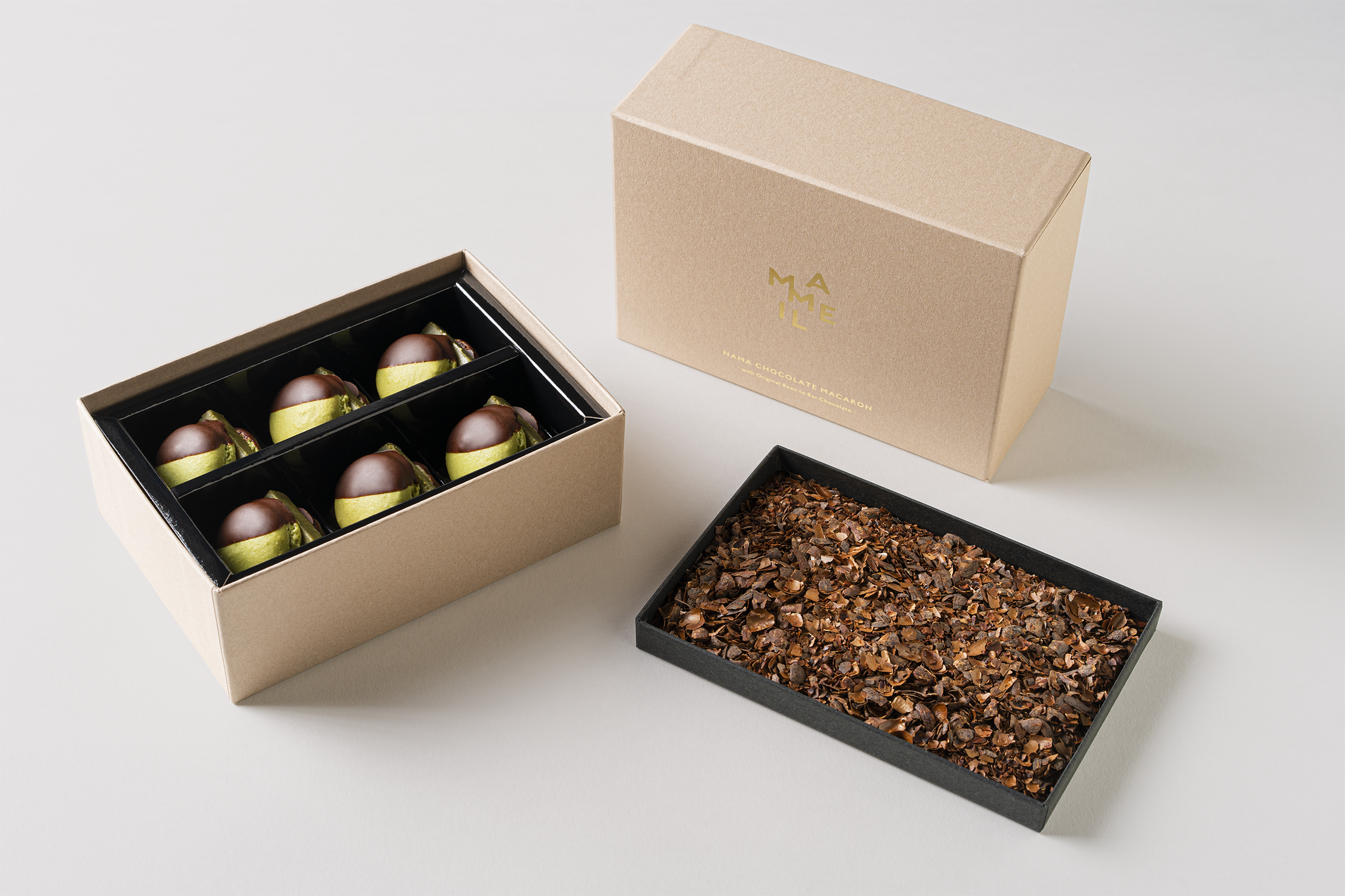 ・箱を開けた瞬間に多幸感溢れる香りを堪能していただけるよう、箱にカカオハスク(カカオの皮※)を 敷き詰めました。 ※カカオハスクは食べることのできる素材です。通常のチョレート作りでは廃棄されますが、カカオ 本来の香りを堪能できる素材であるため、MAMEILでは「香り」という食前香として使用しています。