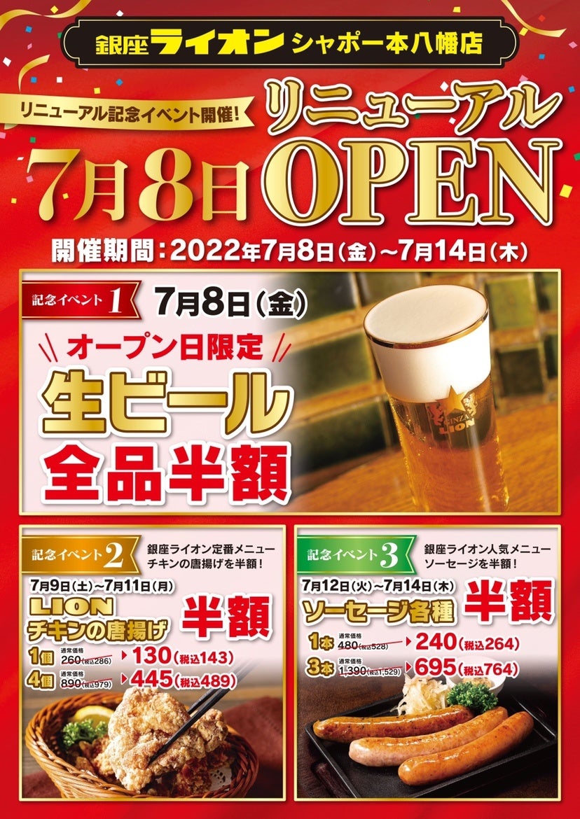 銀座ライオン シャポー本八幡店の開店を記念してイベントを開催します。7月8日の開店当日はもちろん、開店日後もお得にご利用できます。