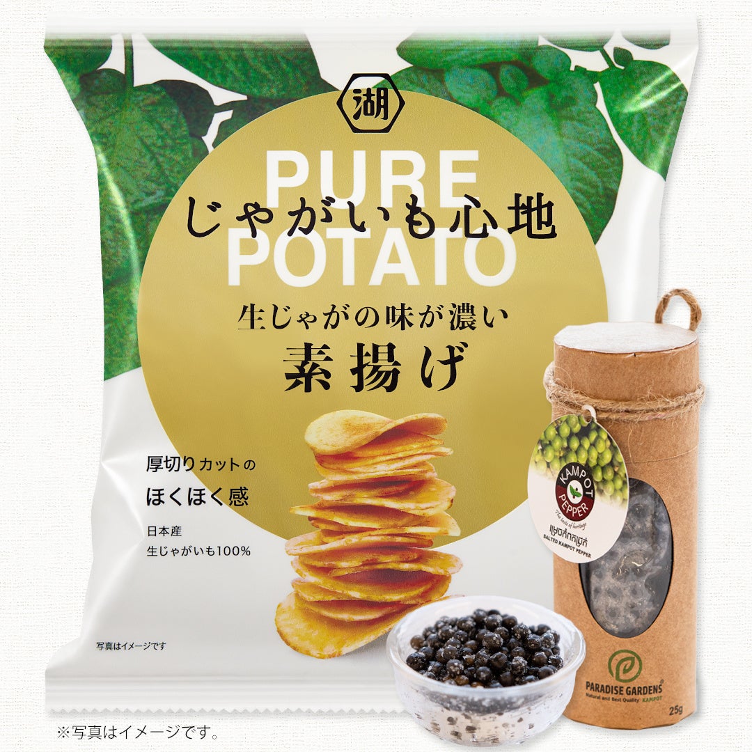 この度、「じゃがいも心地 伝説のペッパーと岩塩」の発売を前に、湖池屋オンラインショップ限定商品として「じゃがいも心地 素揚げ カンポートペッパーセット」を販売いたします。