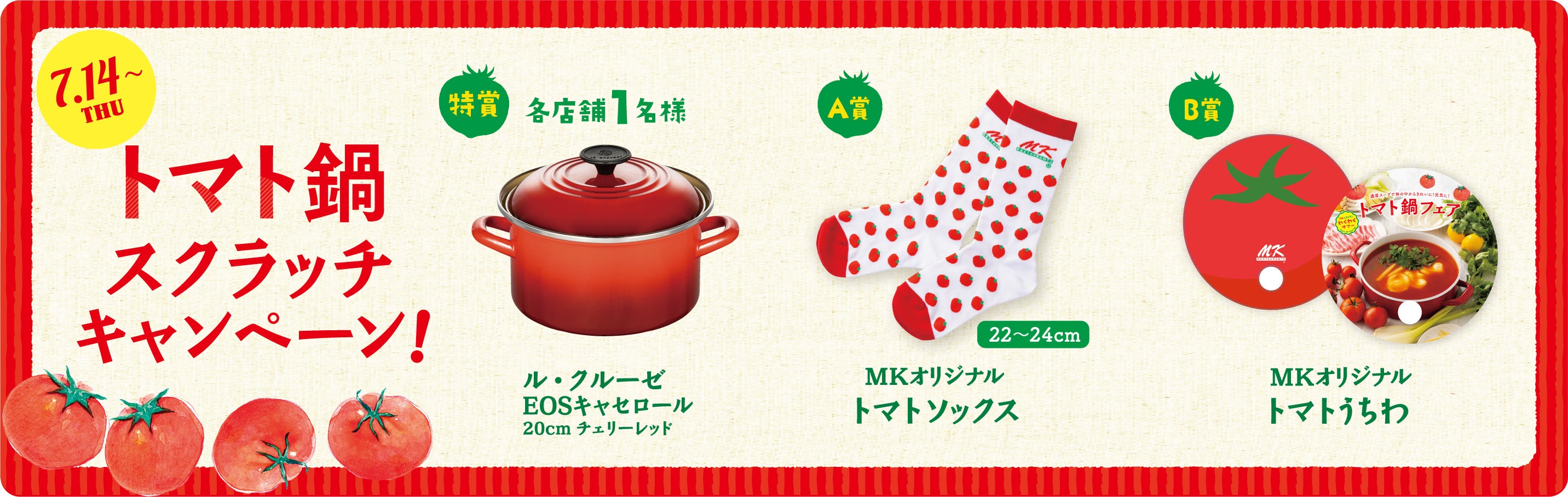 『トマト鍋』の新発売を記念して『トマト鍋スクラッチくじ』キャンペーンを開催します。キャンペーン期間中『トマト鍋』をご注文された方にスクラッチカードを1枚進呈、その場で削って「あたり」が出たら豪華景品と交換いたします。機能的かつ美しいキッチンウェアとして人気の『ル・クルーゼ EOSキャセロール 20㎝チェリーレッド』(各店1名様合計25名様)、この夏サンダルとの組み合わせが可愛い『MKレストランオリジナル トマトソックス』、猛暑には欠かせない『トマトうちわ』などの豪華景品が合計20,085名様に抽選で当たります。