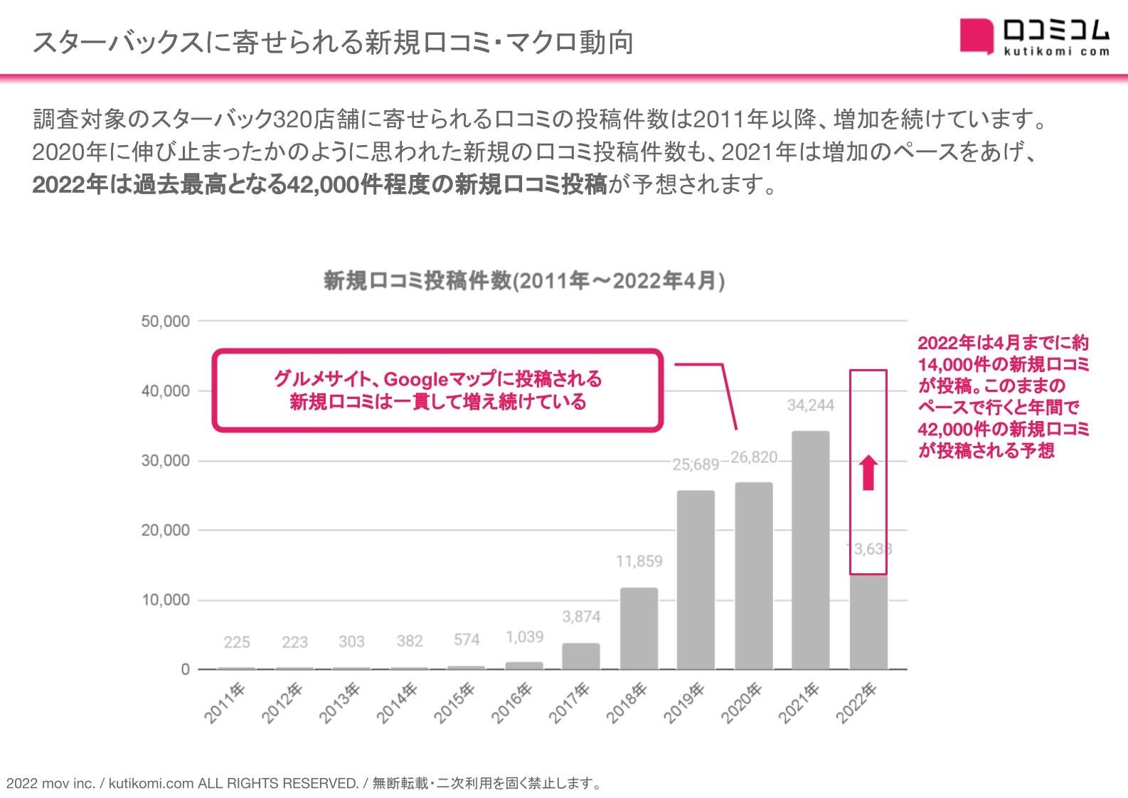 調査対象の全国のスターバックスコーヒー320店舗においては、新規口コミは2016年以降増加し、2022年には、過去最高の42,000件の新規口コミが投稿されると予想されます。