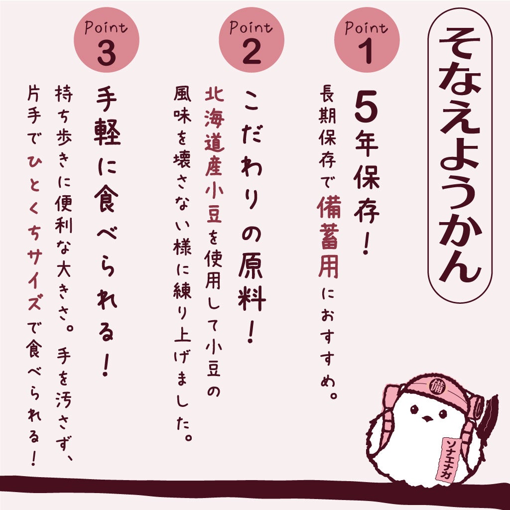 災害時の不安な気持ちを取り除きたいという思いから、小豆原料の産地である北海道生息のシマエナガと「そなえる(備える)」に掛けて「ソナエナガ」という防災キャラクターを作成し、安心感が感じられるカラーにパッケージを一新しました。
