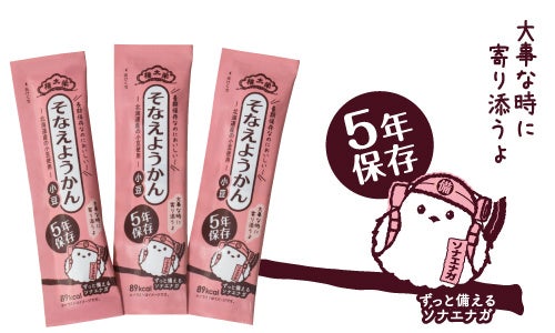 災害時の不安な気持ちを取り除きたいという思いから、小豆原料の産地である北海道生息のシマエナガと「そなえる(備える)」に掛けて「ソナエナガ」という防災キャラクターを作成し、安心感が感じられるカラーにパッケージを一新しました。