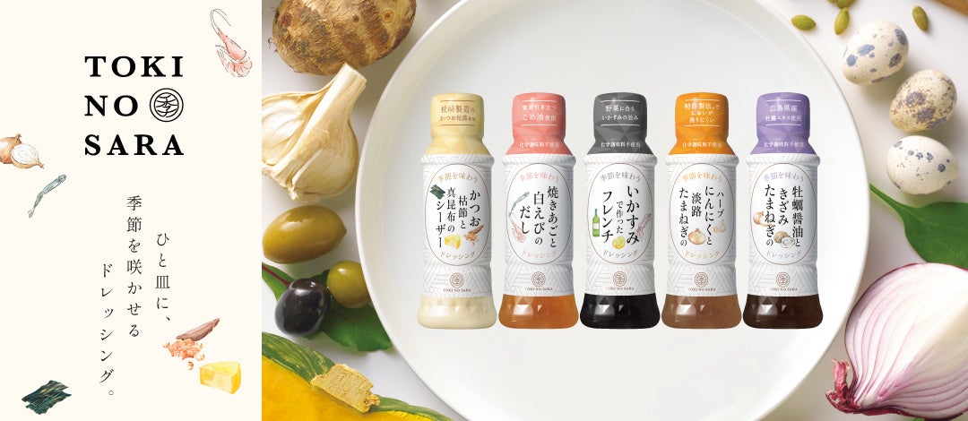 忙しい日々を過ごす現代人に季節を感じる食卓を提案し、日々の暮らしの中で小さなよろこびを感じていただける商品を目指した「季の皿(ときのさら)」シリーズのドレッシング。
