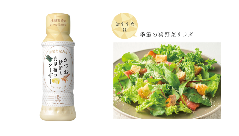 この度の追加アイテム『季の皿 かつお枯節と真昆布のシーザードレッシング170』は、チーズと和素材の相性が良いことに着目。チーズの旨みとかつお枯節と真昆布の上品なだしが旬の食材自身の味を引き立て、飽きずに野菜を沢山食べられる設計です。