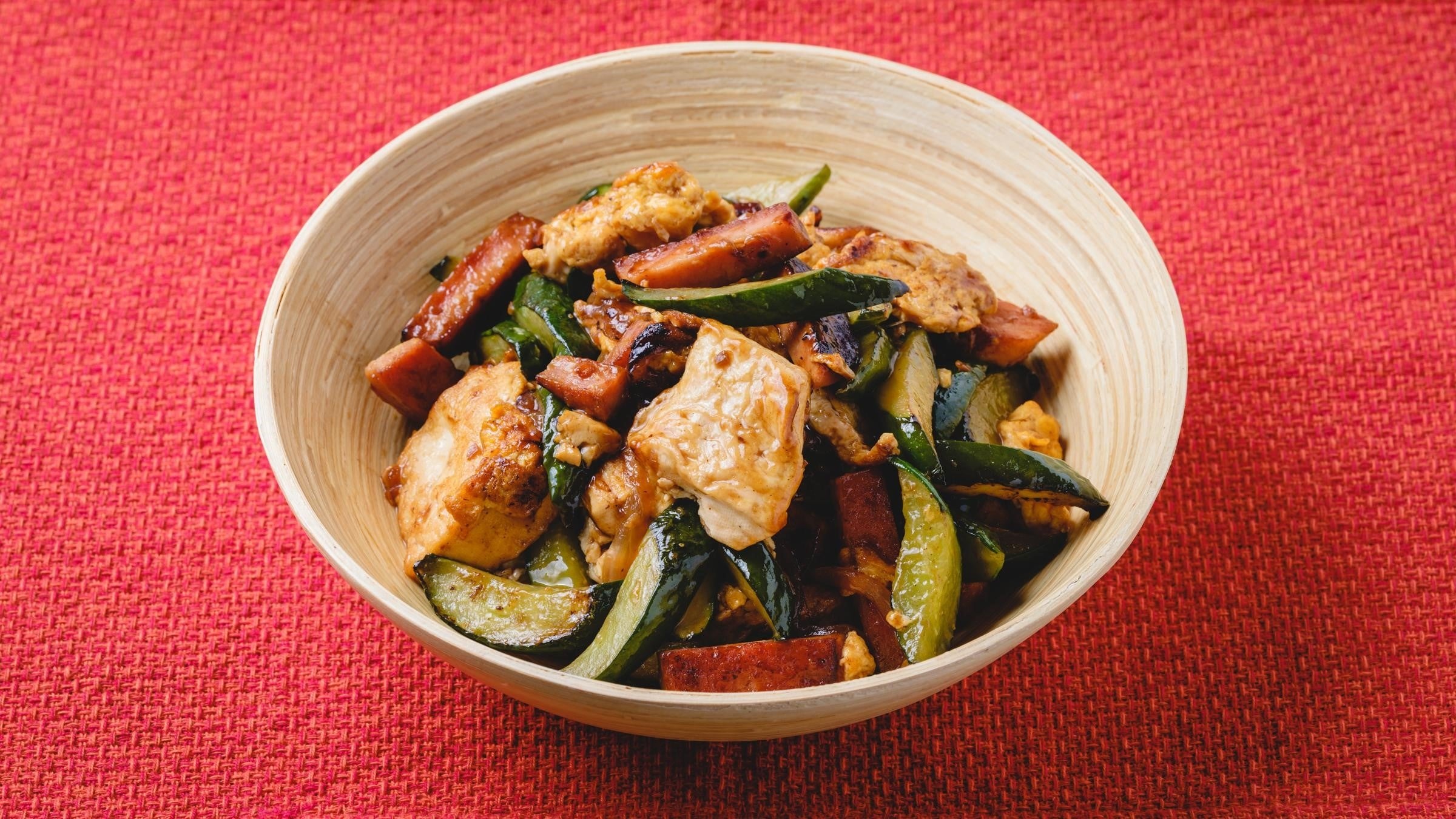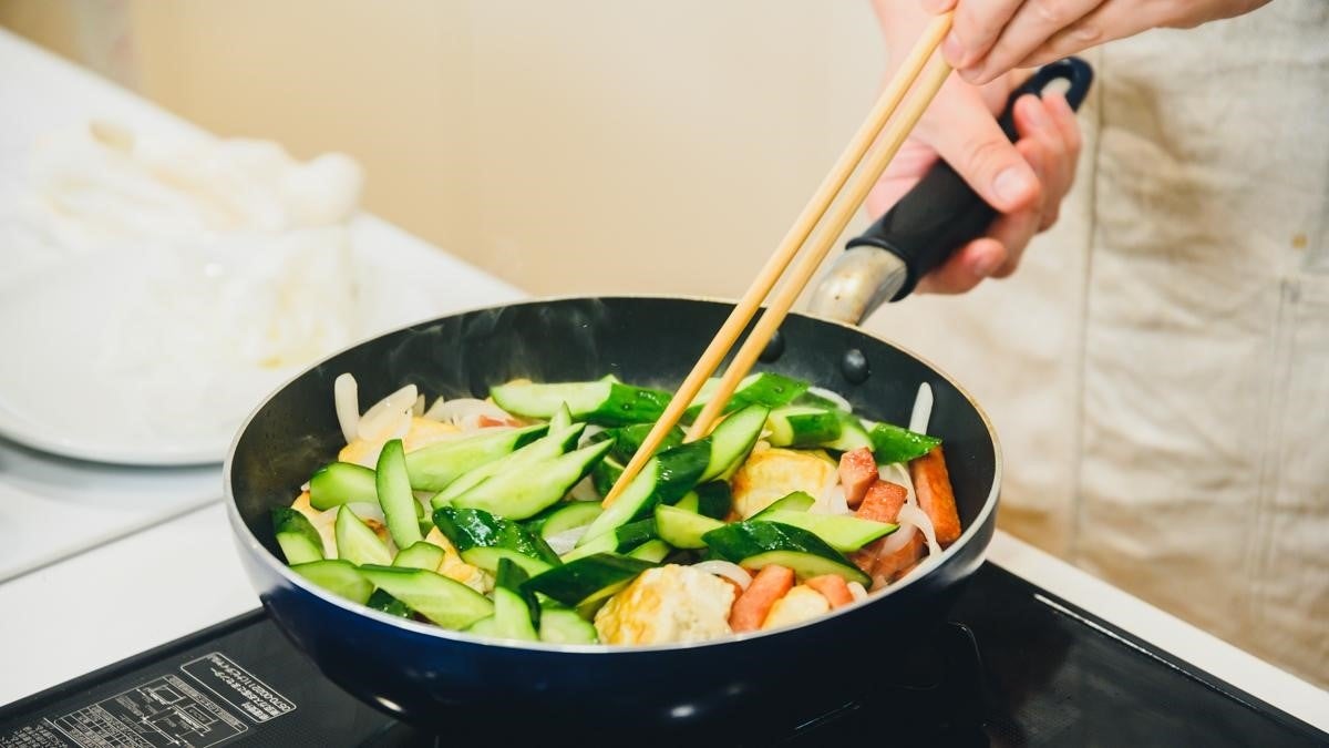 2品⽬は、アンケートで多く寄せられた余りがち⾷材「きゅうり」を、ランチョンミートと⼀緒に炒め合わせるレシピです。