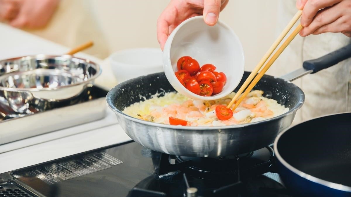 1品目のレシピは、初夏に余りがちな「ミニトマト」や「⽜乳」を使い、シーフードと合わせたクラムチャウダー⾵パエリアです。