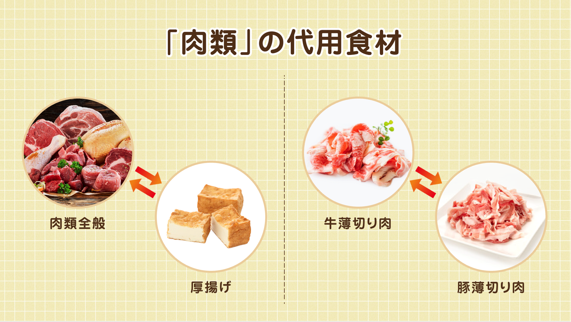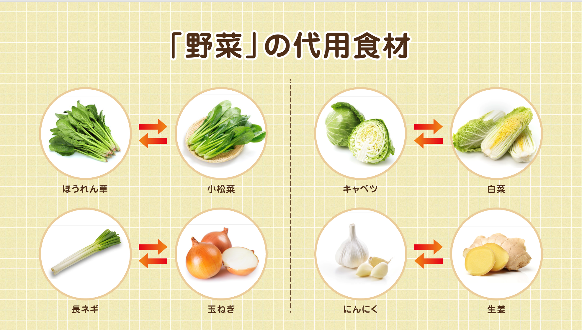 作り置きレシピに続き、野菜・⾁類それぞれの代⽤食材をご紹介しました。