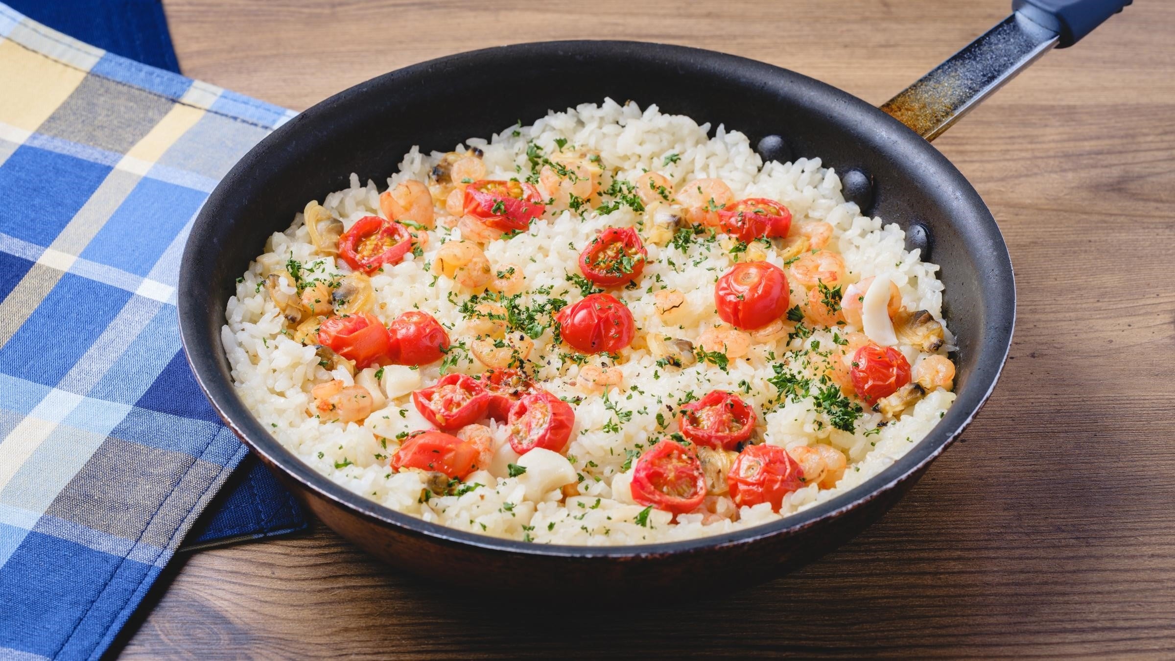 ①ミニトマトとシーフードのクラムチャウダー風パエリア