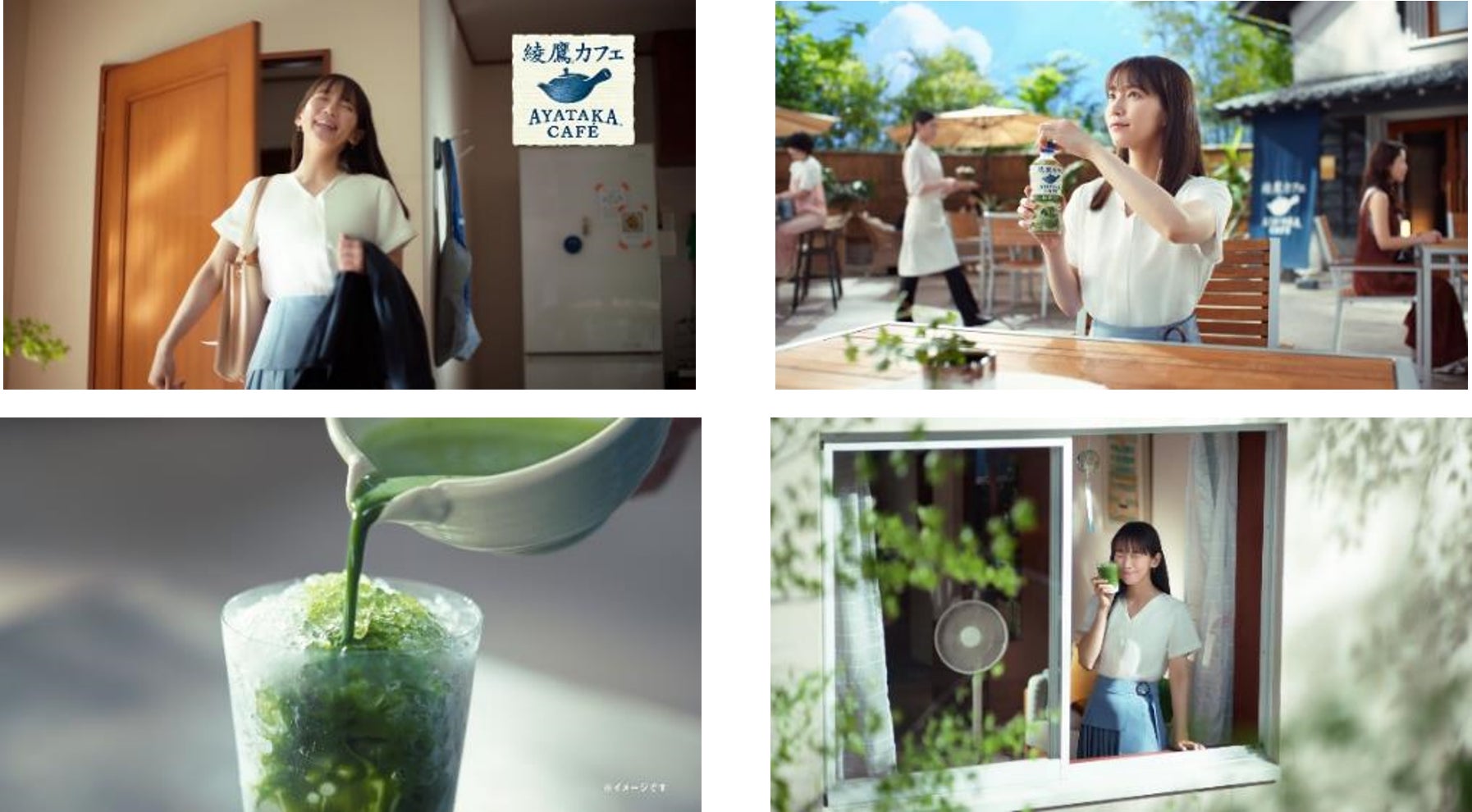 吉岡里帆さんが「あっつ~」と言いながら、真夏の外出から帰宅するシーンから始まります。「綾鷹カフェ 抹茶ラテ」と氷の入ったグラスを手に「冷たいカフェにしますか」と笑顔でボトルをあける吉岡さん。すると場面は家からカフェのテラス席へと早変わり。「夏は氷ラテ」と一言語り、冷たい「綾鷹カフェ」を一口飲み、最後は家の窓際でグラスを頬にあて「つめたっ」と喜ぶ吉岡さんの姿で締めくくります。