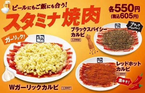 期間限定メニューのもう1つの目玉は、ニンニク・ブラックペッパー・唐辛子を大量にのせた豪快トッピングが魅力の3種の「スタミナ焼肉」 各550円(税込605円)です。