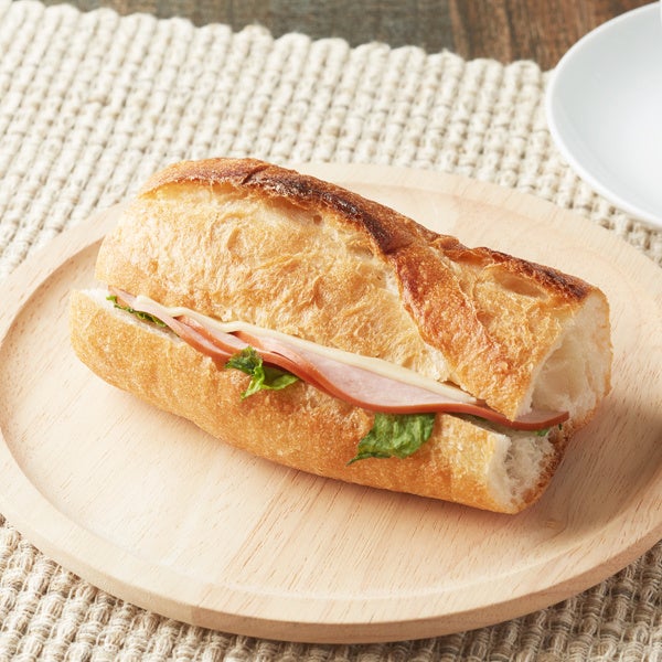 【内容】石窯パンにハムとチーズを挟みました。オーブンで焼くことで、パリジャンの外側がパリッとした食感が楽しめます。