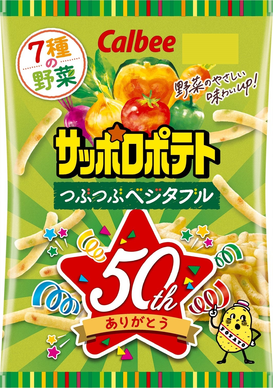 1972年12 月に「かっぱえびせん」の姉妹品として発売(発売当時の商品名は「サッポロポテト」)。カルビーとして初めて生のジャガイモを原料に使った商品です。ジャガイモの一大産地が北海道であり、1972年の札幌オリンピックの年に誕生したことから、「サッポロポテト」と名付けられました。現在はジャガイモをベースに7種の野菜※1(ほうれんそう、にんじん、ピーマン、かぼちゃ、トマト、たまねぎ、レッドビート)を生地に練り込んだ、野菜のやさしい味わいが楽しめるスナックです。小さなお子様の手でも持ちやすいスティック形状で、見た目にも楽しい“野菜のつぶつぶ”入りです。