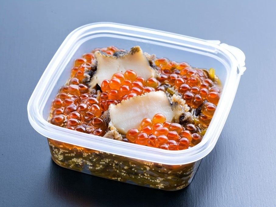 めかぶ醤油漬に、「だまし煮」という技法で柔らかく煮上げたあわびと、濃厚いくらをトッピングした大人気商品です。