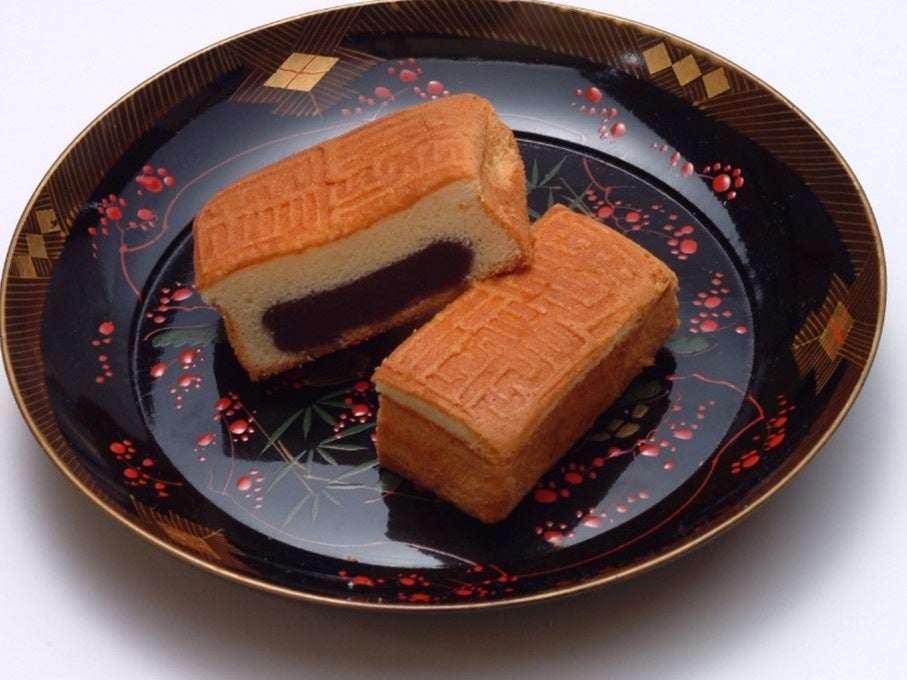 押文様は会津藩公の文庫印「会津秘府」をうつしたもの。1962年に餡入りカステラの創案が認められ、科学技術庁長官より創意工夫功労者章をうけた逸品です。
