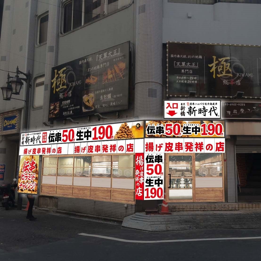 登録商標『伝串』が旨いと大人気!日本一のパリモチ鶏皮串「伝串」は1本50円(税込55円)。さらに、生中(サッポロ黒ラベル)は、1杯190円(税込209円)と、圧倒的なコストパフォーマンスも発揮しております。