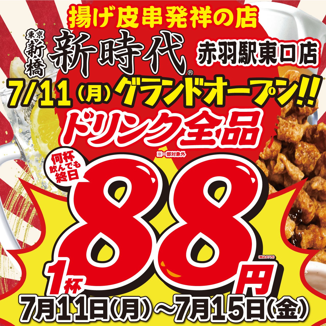 「新時代 赤羽駅東口店」のオープンを記念し、ドリンク全品を1杯88円(税込97円)でお楽しみ頂けるキャンペーンを開催します。