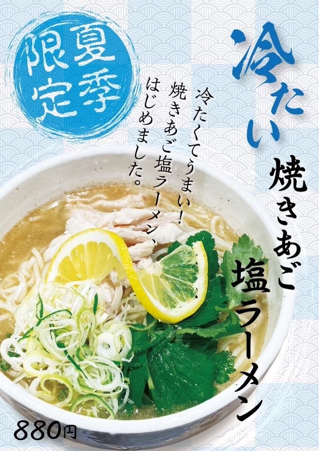 夏季限定の冷たい焼きあご塩ラーメンもご用意しております。熱中症予防や、夏バテに負けないようにしっかり食べて元気に夏を乗り越えてください!