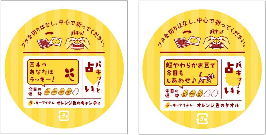 「金のつぶ® パキッ!とたれ™ とろっ豆™」をお買い上げ、お召し上がりいただいている皆様、いつもありがとうございます。今回は「とろっ豆」を通じて皆様の食卓の時間をさらに楽しんでいただきたく、採用している“パキッ!とたれ”のたれフィルムに『パキッ!と占い』のデザインをつけさせていただきました。全21種類ある「とろっ豆からのひとこと」はなんだがゆるくて、少しほっこりとした気分にさせてくれると思います。